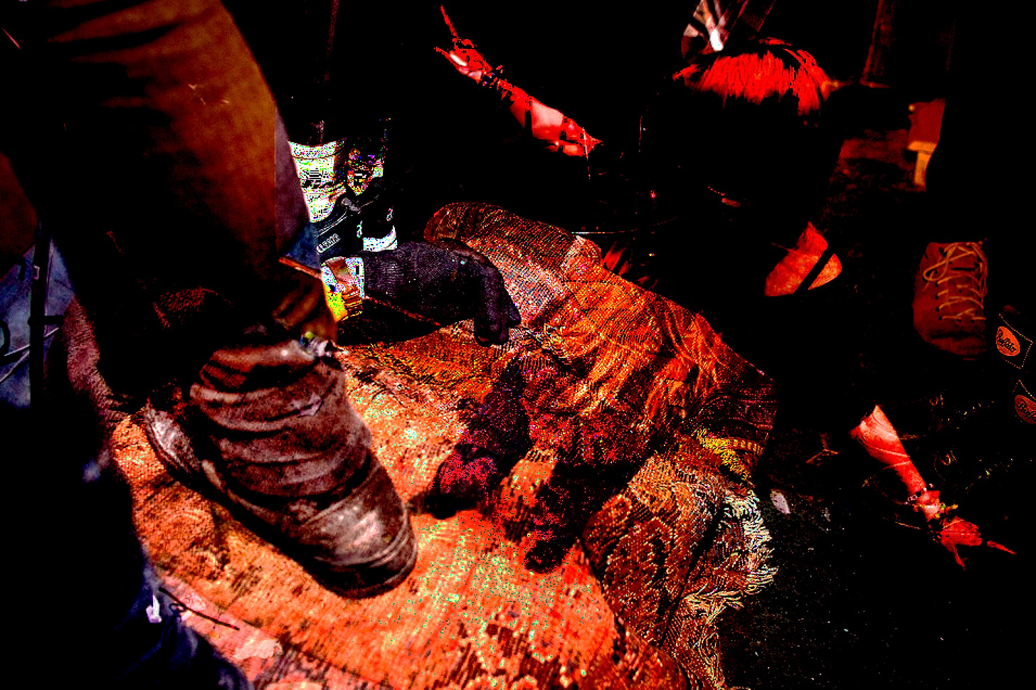 In the blackout obscurity of a rolled up rug, things did clarify. Pain was the mechanism, nailing him to the moment as the hours rolled on. Sensation bloomed in thousand-petalled lotus flowers—purple, red, lime—poof, then another, and another, thousand-petalled lotus bouquets bursting in his skull. Somebody’d come along and know just where to stand, pinning his scrotum to his leg, or bashing in his nose. A cracking sound, things coming out of place inside of him; the nectar of blood dripping down his throat. He was waiting for the blow to shift everything, ‘cause what could be more Buddhist than seeing through the eyes of an inanimate object? Practicing self-less rugness? But it was a process of becoming; he was not there yet. Still desire rushed to parts of him not flat or bloodless. His inner eye ambled up feet, ankles, calves, thighs, upper thighs, and so on, until it burrowed into the collective pleasure center rooted in his pain.